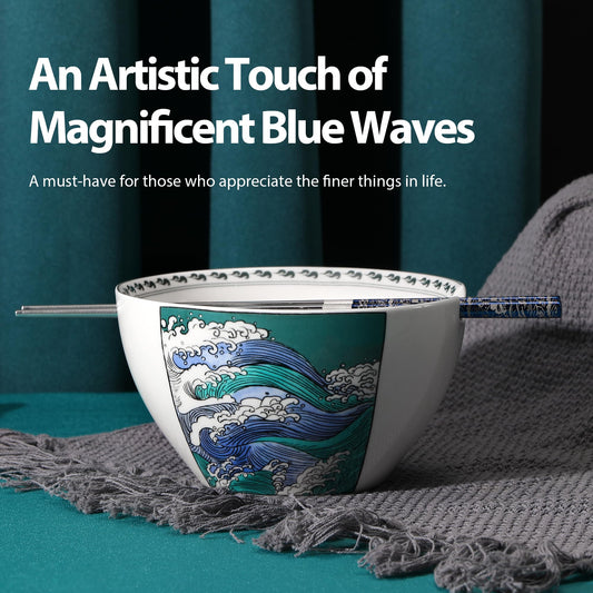 Wave Ceramic Ramen Bowl With Reusable Stainless Steel Chopsticks