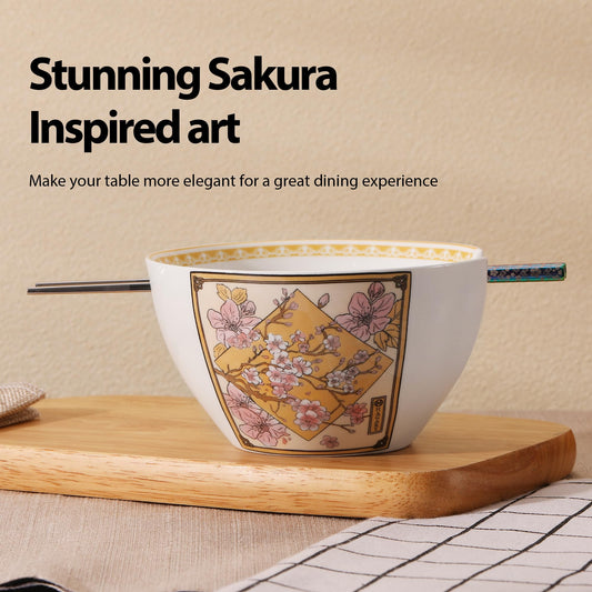 Cherry Blossom Ceramic Ramen Bowl With Reusable Stainless Steel Chopsticks